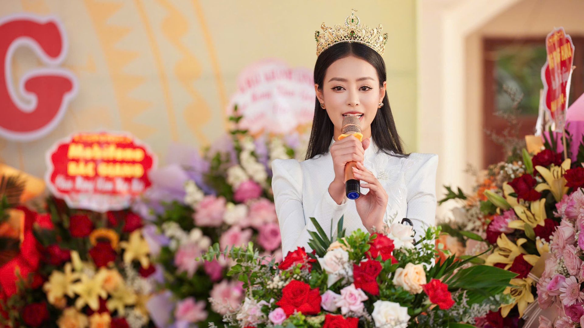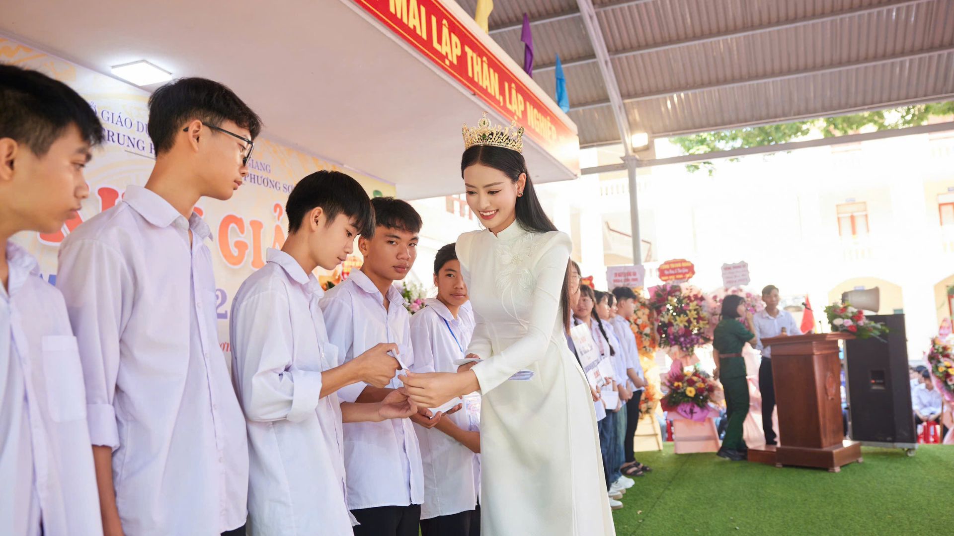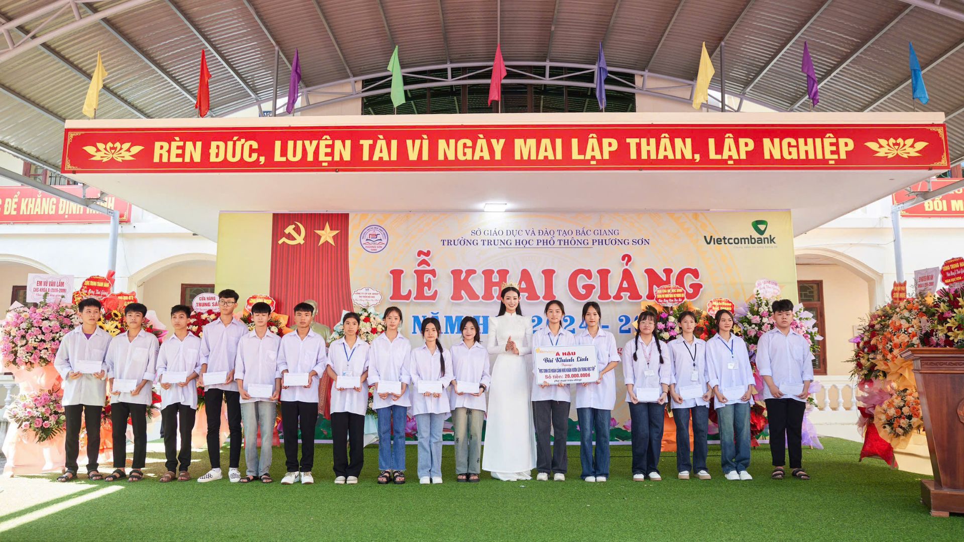 Bùi Khánh Linh diện trang phục áo dài trắng, nổi bật cùng chiếc vương miện Á hậu 1 Miss Grand Vietnam 2023 khi xuất hiện tại THPT Phương Sơn (huyện Lục Nam, tỉnh Bắc Giang). Tại đây, cô nhận được sự chào đón nồng nhiệt từ thầy cô giáo cũng như hàng ngàn học sinh trong ngày tựu trường.