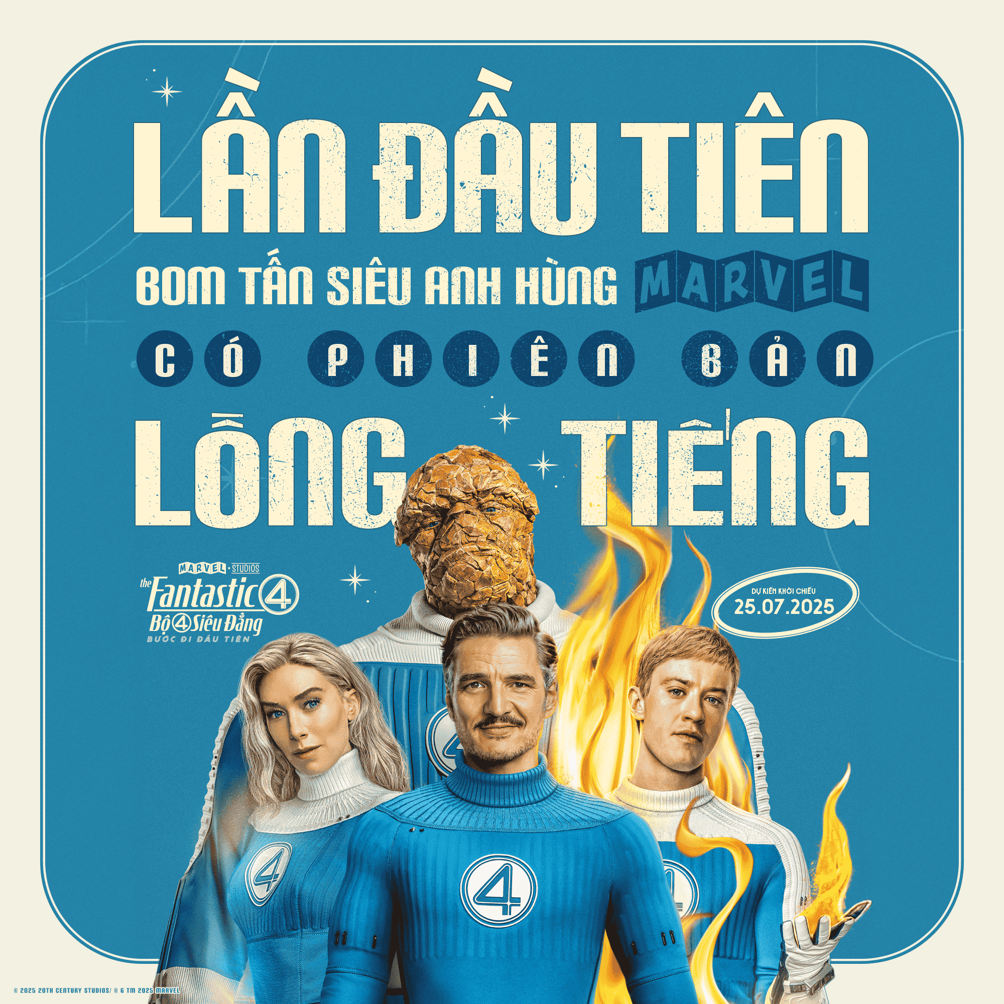 Ngày 3/7, Marvel Studios chính thức công bố bom tấn siêu anh hùng đang được mong đợi “The Fantastic Four: First Steps” sẽ ra mắt tại Việt Nam với phiên bản lồng tiếng Việt vào ngày 25/7/2025 tới. Đây là lần đầu tiên một bộ phim thuộc Vũ trụ Điện ảnh Marvel (MCU) được lồng tiếng Việt và phát hành chính thức tại rạp dành riêng cho khán giả trong nước.