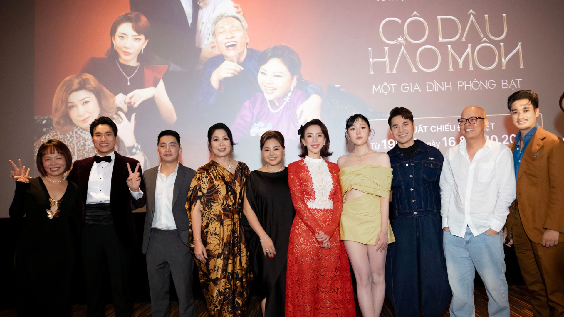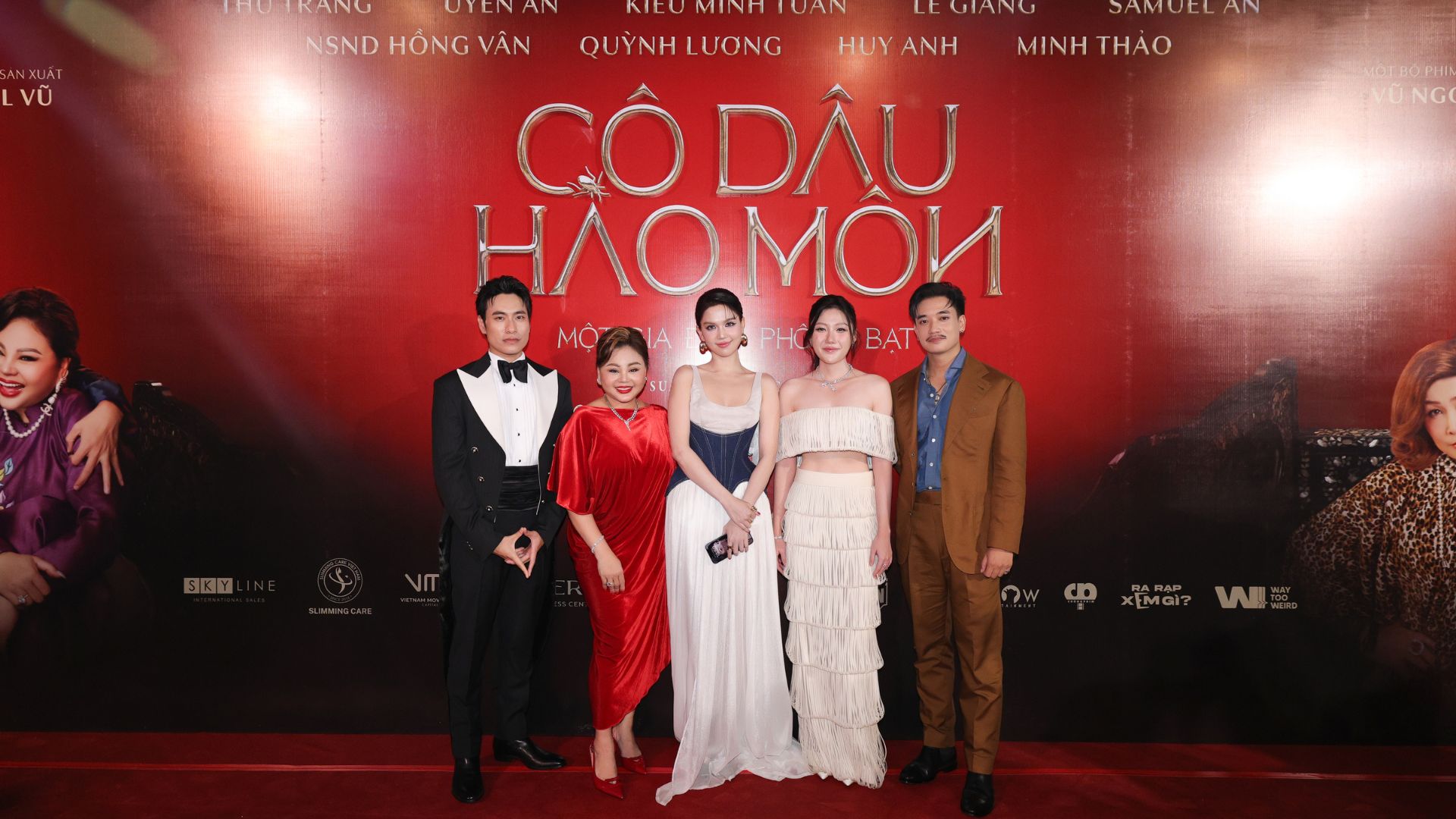 Backdrop trên thảm đỏ của buổi ra mắt còn gây chú ý bởi đạo cụ chiếc ghế nhựa sơ sài lạc lõng trước dàn sao lộng lẫy và hào nhoáng. Như trailer đã gợi ý về một gia đình “phông bạt”, Cô Dâu Hào Môn không chỉ là câu chuyện về làm dâu nhà hào môn, sự khác biệt giàu nghèo mà còn là lối sống phông bạt giả tạo. Cặp mẹ con “kệch cỡm nhất màn ảnh Việt” là NSND Hồng Vân và Quỳnh Lương cũng là một ẩn số thú vị trong phim, nằm giữa vẻ giàu sang quý phái của gia đình mẹ con Thu Trang – Samuel An và gia đình “phông bạt” thoát nghèo Kiều Minh Tuấn, Lê Giang và Uyển Ân.