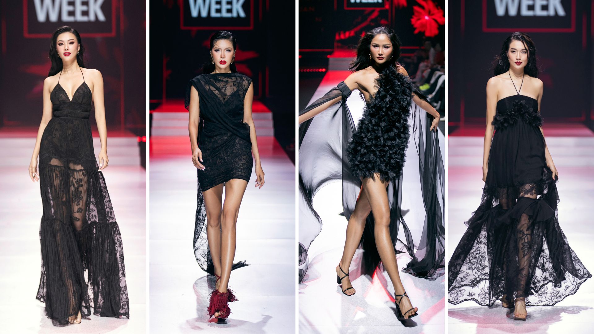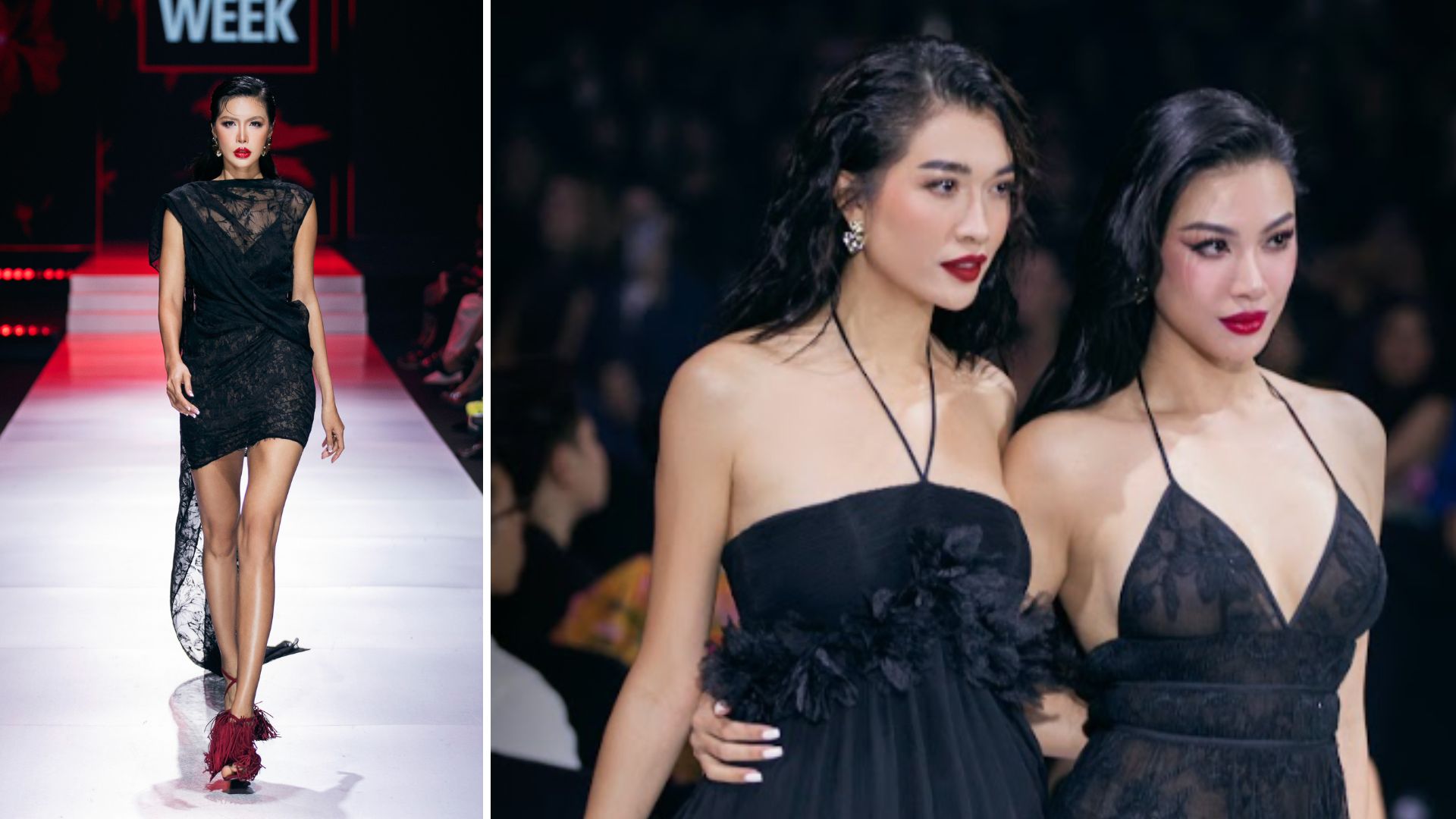 Kết hợp cùng điệu nhạc cuốn hút và như tiếng gào thét của tình yêu, những sải bước mở màn của cặp đôi Á hậu Lệ Hằng – Kim Duyên thu hút mọi ánh nhìn. Nàng Á hậu Lệ Hằng khoác lên bộ váy với chất liệu tơ bay bổng, có phần xuyên thấu đầy gợi cảm, phối hợp cùng chi tiết kết đính hoa được làm từ tơ lụa mềm mại. Sánh đôi với cô trên sàn runway, Á hậu Kim Duyên “bốc lửa” trong bộ váy hai dây xuyên thấu bằng tơ lụa đen, điểm xuyến chi tiết hoa nửa kín nửa hở thời thượng. Với thần thái sang trọng, quyến rũ cùng sự kết hợp ăn ý trong từng nhịp bước và cú hất váy mở màn chấn động, hai nàng Á hậu đã phô diễn trọn vẹn nét gợi cảm nhưng không kém phần sang trọng.