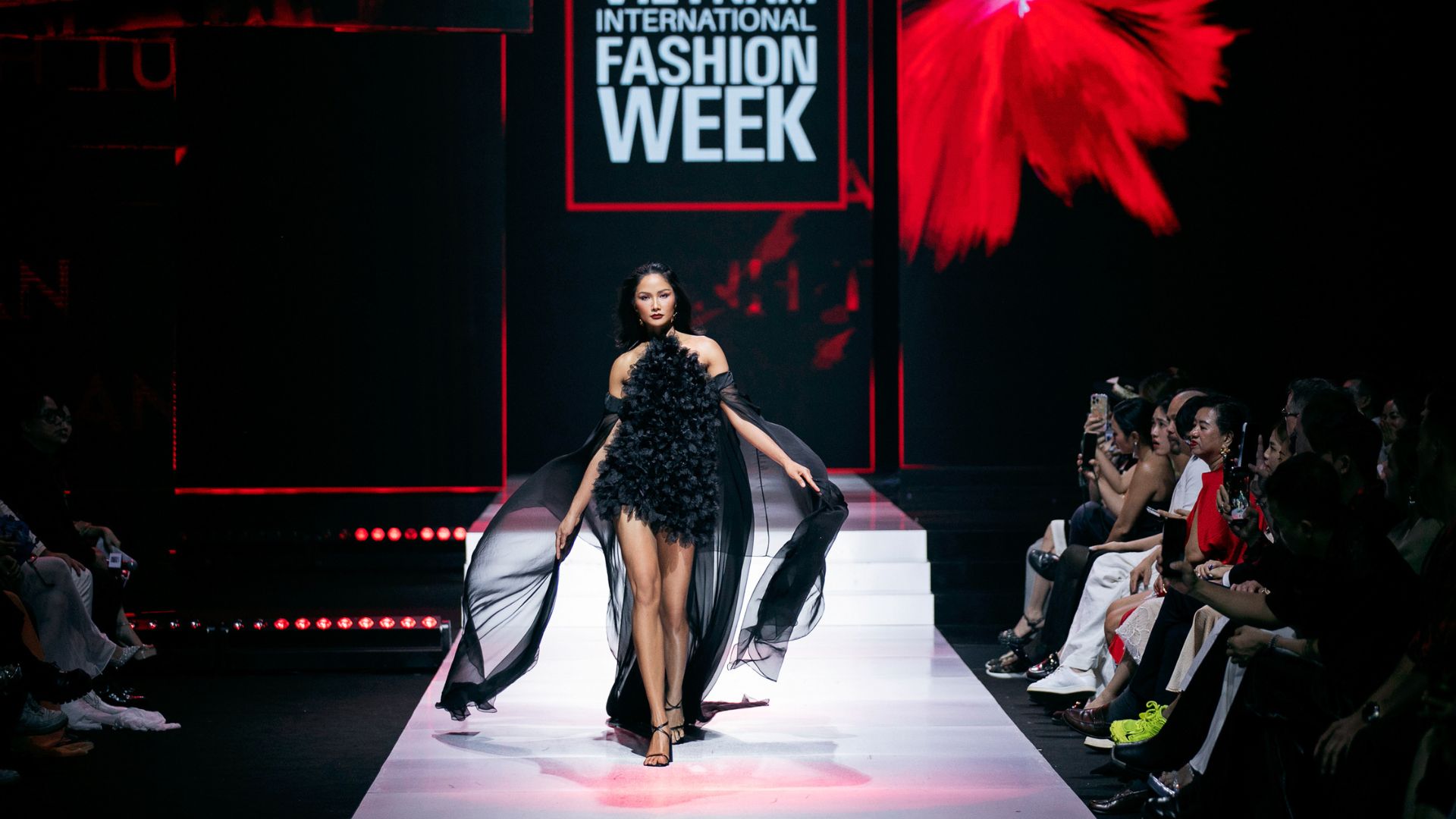 Đặc biệt hơn nữa, màn xuất hiện của nàng hậu Minh Tú trong bộ váy ngắn bằng tơ lụa đen được thêu hoa tỉ mỉ, hiện đại, và phần tà phá cách được thả qua vai, bay bổng theo từng sải bước đã giúp Minh Tú tỏa sáng rực rỡ trên sàn runway.