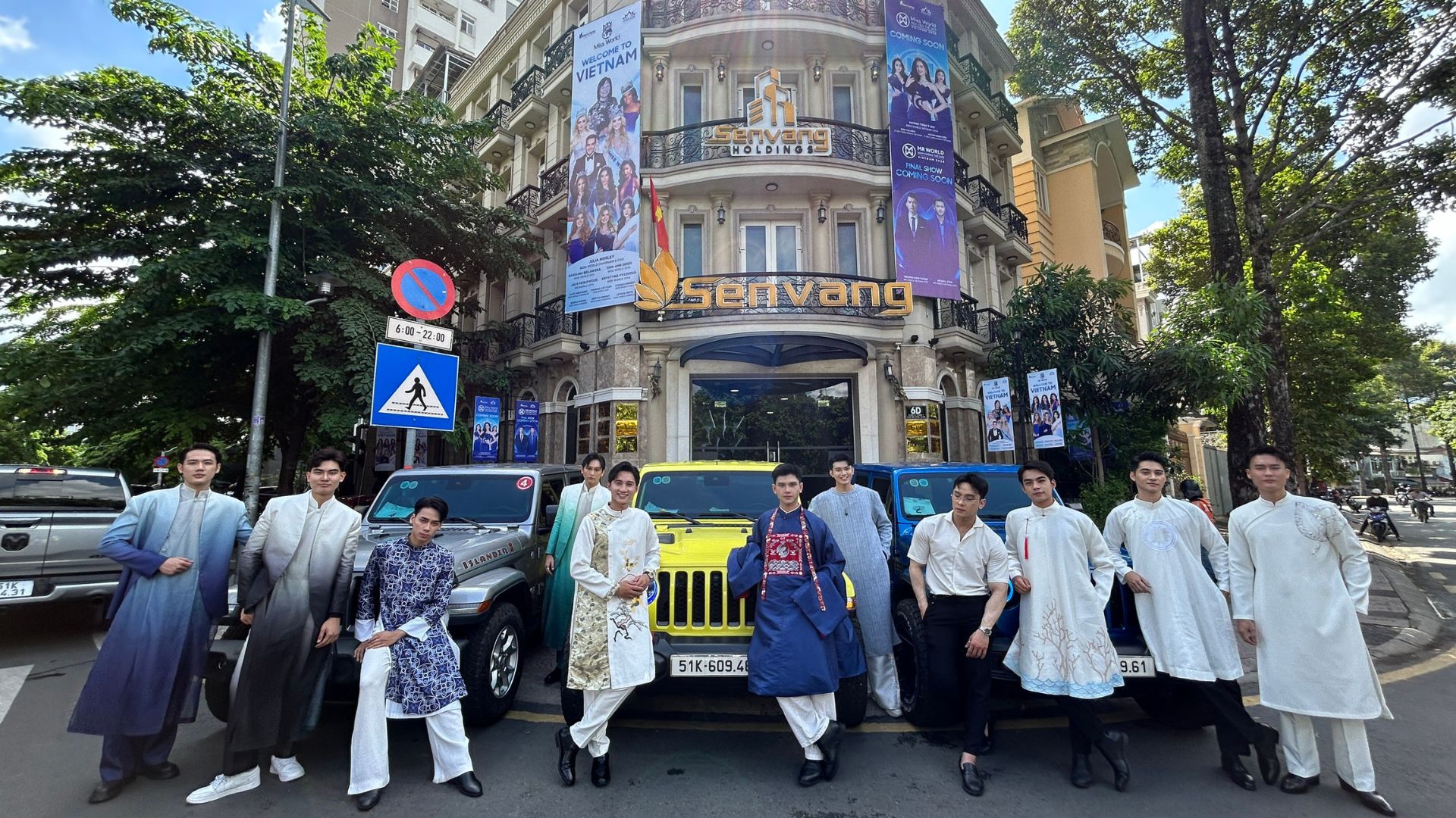 Đoàn Việt Nam gây ấn tượng khi diện trang phục áo dài truyền thống. Ngoài ra, công ty Sen Vàng còn chu đáo chuẩn bị dàn xe sang hoành tráng để chào mừng đoàn chủ tịch MR WORLD.