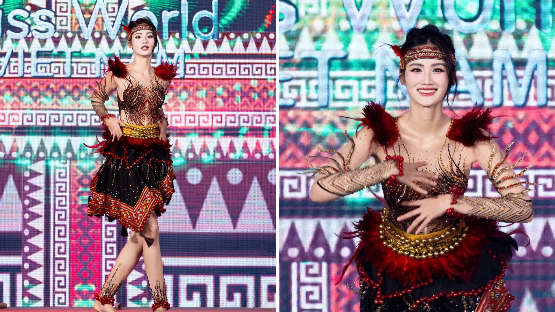 Trong khi đó, trang phục Dance Of The World của Ý Nhi mang tên “Vũ điệu đại ngàn” do hai nhà thiết kế trẻ Quách Tâm Trí và Trần Hoàng Nam thực hiện, lấy cảm hứng từ vùng núi rừng Tây Nguyên hoang dã và huyền bí. Hoàn thiện trong vòng 2 tháng, sử dụng nhiều kỹ thuật đính kết, dựng gọng…