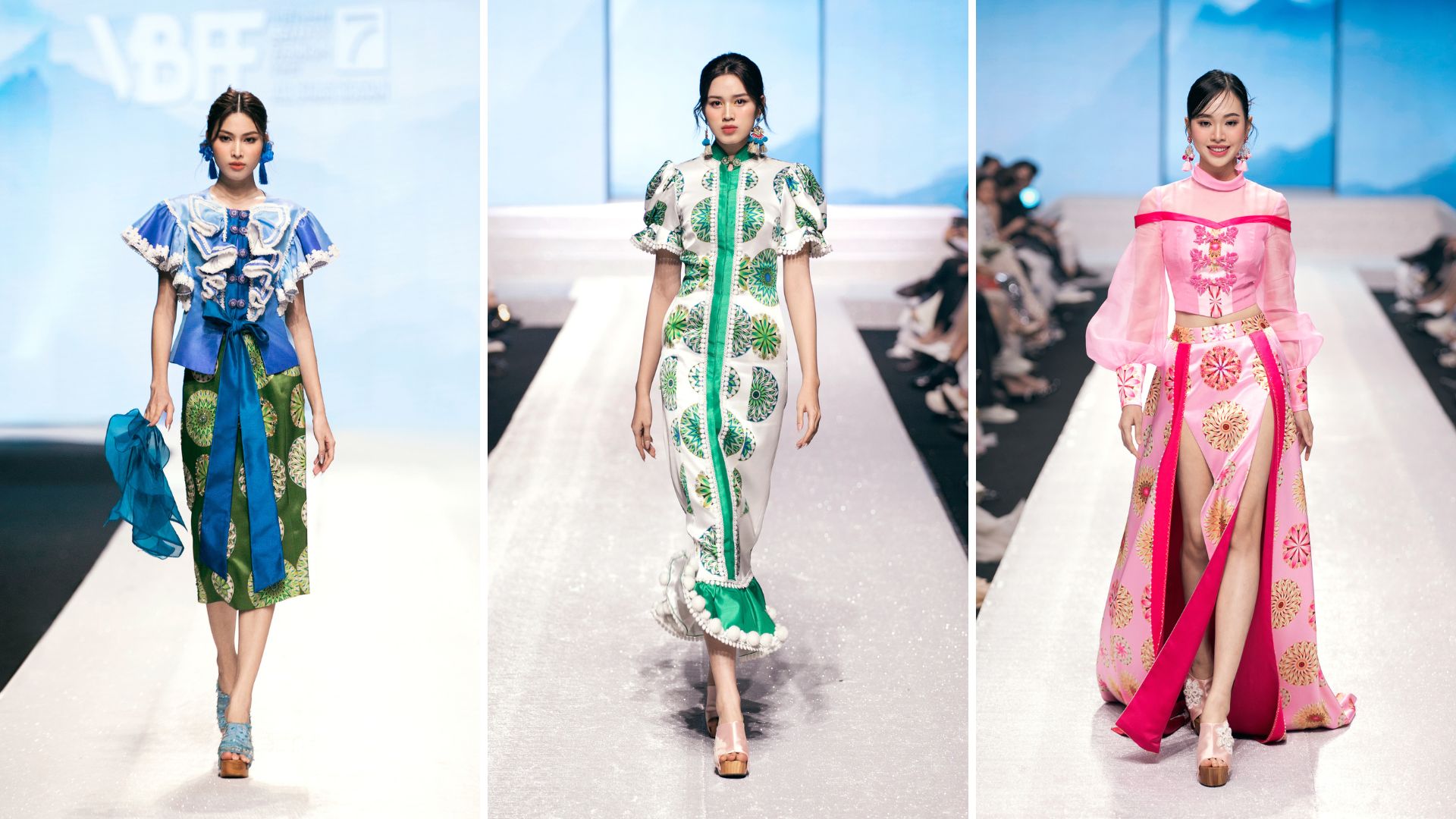 Các nàng hậu góp phần đưa BST Sương mai đến khán giả hơn: Á hậu Hồng Hạnh, Tâm Như, Bùi Khánh Linh (từ trái sang phải)
