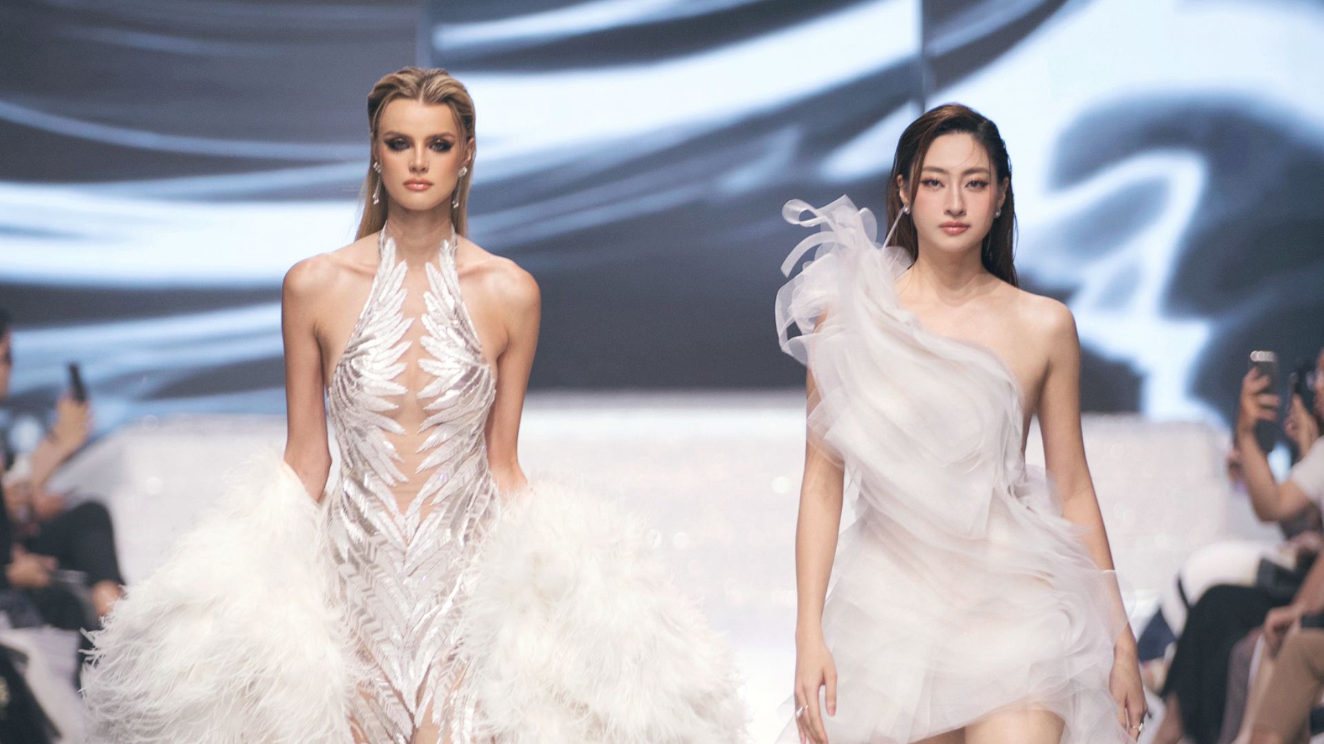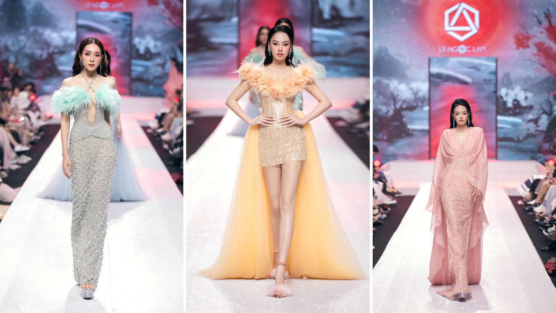 Khi những tia sáng đầu tiên của một ngày mới chiếu rọi, những giọt sương ấy tạo ra những khoảnh khắc lấp lánh, trong trẻo và đầy mê hoặc. Để thể hiện điều đó, Hoa hậu Thiên Ân và Thanh Thủy mở màn. Vẻ trong trẻo, tươi sáng của đương kim Hoa hậu Việt Nam và Miss Grand Vietnam 2022 làm tôn lên những thiết kế đầy tính nữ trong BST của Lê Ngọc Lâm.