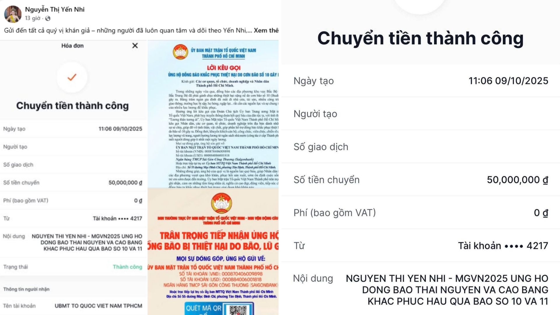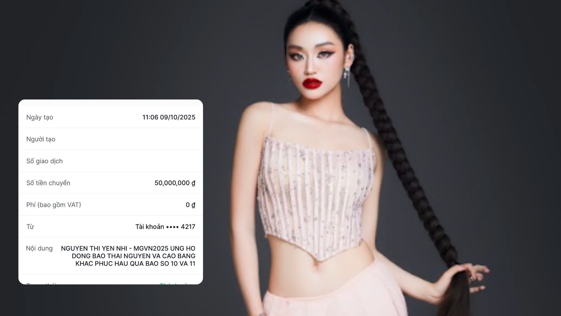 Với mong muốn chung tay sẻ chia cùng bà con vùng chịu thiệt hại, Yến Nhi quyết định trích 50 triệu đồng từ tiền thưởng đăng quang Miss Grand Vietnam 2025 để gửi đến Quỹ Cứu trợ của Ủy ban Mặt trận Tổ quốc Việt Nam. Do đang thi sắc đẹp ở Thái Lan, Yến Nhi ủy quyền cho công ty Sen Vàng thay cô thực hiện giao dịch chuyển khoản.