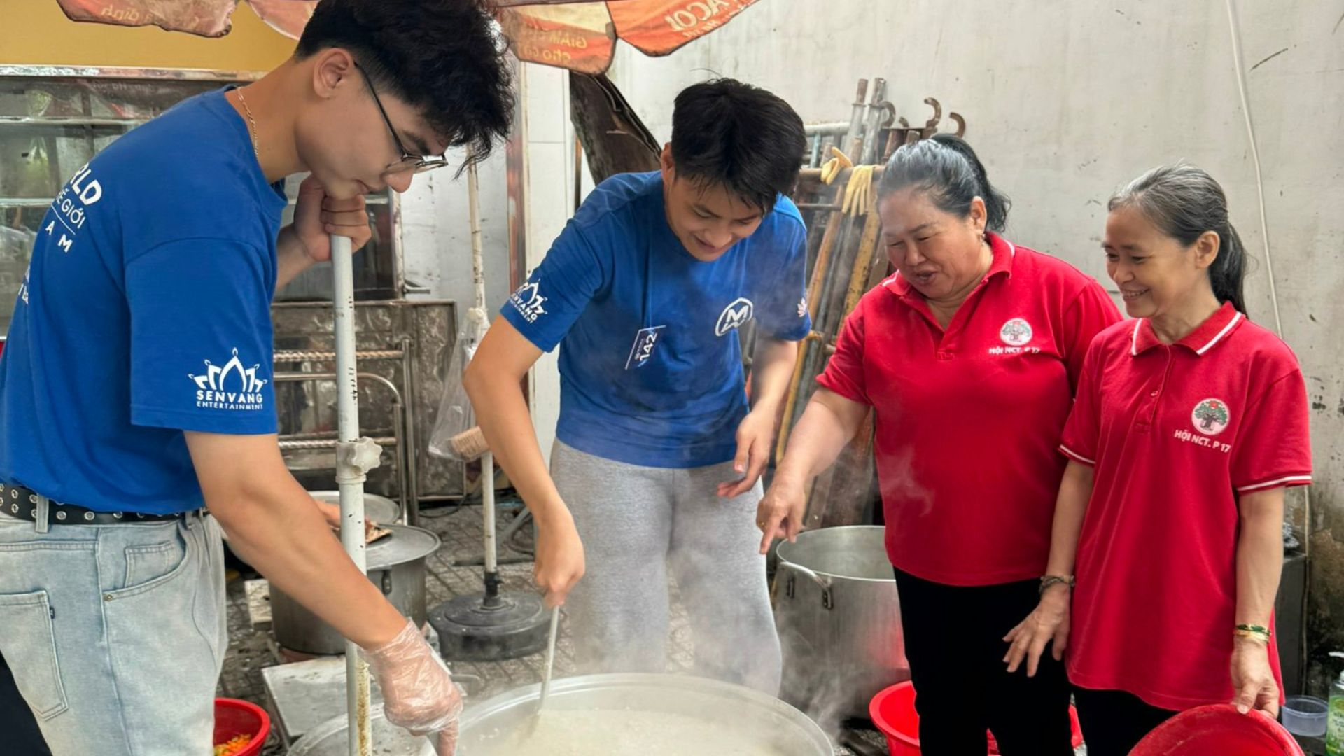 Thí sinh Nguyễn Hữu Duy, Ngô Trung Nguyên cho biết đã dậy từ 5h sáng để tham gia hoạt động nấu cháo. “Mọi người làm việc hăng say, nụ cười từ tâm, lan toả một nguồn năng lượng tích cực để chữa lành”, thí sinh Huỳnh Tiến Đạt chia sẻ. “Cháo rất ngon, đủ topping, tôi cảm nhận được việc mọi người dậy sớm đi làm nên rất hạnh phúc”, thí sinh Phan Ngọc Giang chia sẻ khi ăn sáng bằng chính hộp cháo mình đang phát.